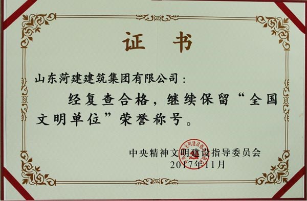 集團(tuán)公司繼續(xù)保持“全國(guó)文明單位”榮譽(yù)稱號(hào),即是對(duì)文明創(chuàng)建工作的肯定,也是一種鞭策和激勵(lì)。文明創(chuàng)建永遠(yuǎn)在路上,下一步工作中,集團(tuán)公司將不忘初心,繼續(xù)前進(jìn),深入鞏固和擴(kuò)大全國(guó)文明單位創(chuàng)建成果,為打造“百年菏建”做出新的更大的貢獻(xiàn)。