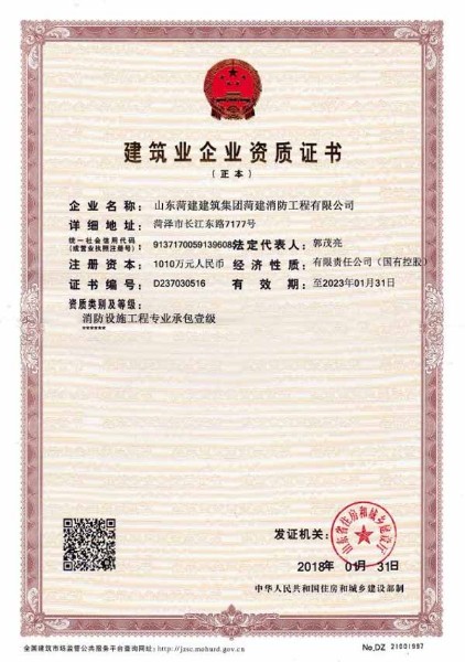 1月31日,經(jīng)山東省住房和城鄉(xiāng)建設(shè)委員會審核批準(zhǔn),集團消防公司順利獲得消防設(shè)施工程專業(yè)承包壹級資質(zhì),為集團公司發(fā)展壯大再添基石。