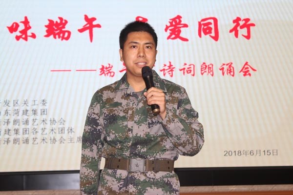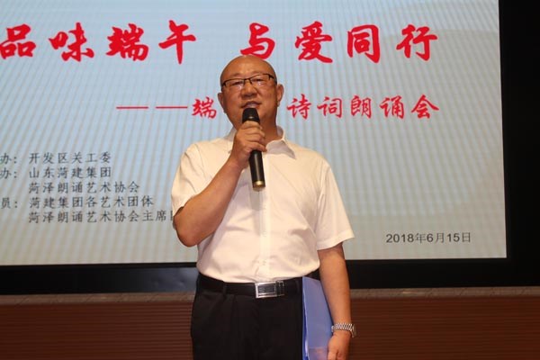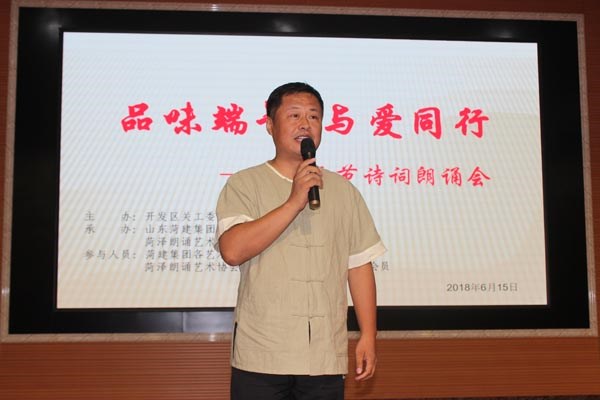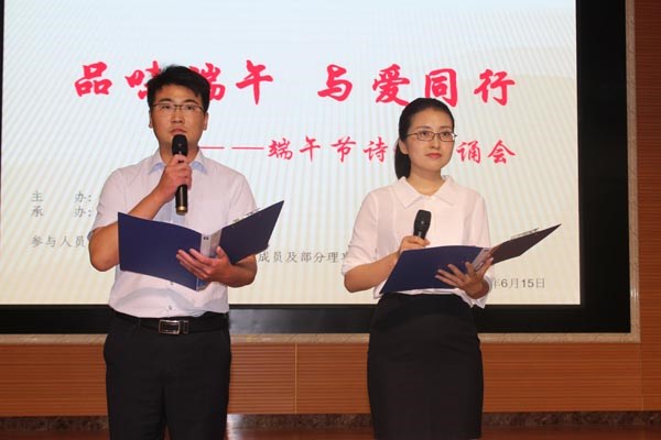 揭牌儀式結束后,菏澤市朗誦藝術家協(xié)會聯(lián)合集團朗誦協(xié)會舉辦了“品愛端午與愛同行”詩詞朗誦會。市朗誦藝術協(xié)會周忠良、趙巨聲、李東娟、徐茵、辛云霞、苑蕾、瞿曉妍等著名藝術家登臺表演,集團黨委副書記任永信及職工李霞、孔令陽、張濤、王會敏、汲艷玲等與藝術家同臺演出,《紅梅喚春》《蘇軾:水調歌頭》《如夢令》《宣州謝朓樓餞別校書叔云》《名著里的端午節(jié)》等一首首或古代、或現(xiàn)代、或優(yōu)美、或深沉的中華經典詩文、現(xiàn)代詩歌和個人原創(chuàng)作品,通過滿懷深情的朗誦表達出來,傾情抒發(fā)著自己對祖國的情感,對中華悠久文化的贊美。