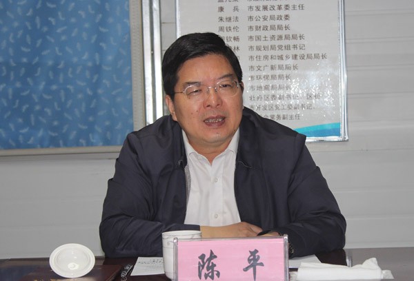 集團(tuán)黨委書記、董事長李信強(qiáng)(左一)向陳平市長匯報項(xiàng)目情況