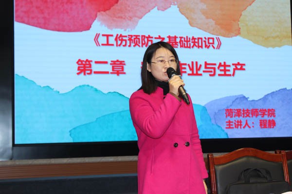 菏澤技師學院高級講師程靜從安全色與安全標志、勞動防護用品、觸電工傷事故與預(yù)防、機械傷害與預(yù)防、火災(zāi)與爆炸、施工現(xiàn)場案例分析等六個部分,并結(jié)合生產(chǎn)生活實際,為大家進行了生動形象的講解,深入淺出、讓人受益頗深。