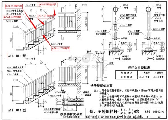 室內(nèi)選用國標(biāo)圖集06j403-1中P23頁A11B11型,部分不銹鋼管以紅色標(biāo)注為準(zhǔn),其余按圖集施工,詳附圖。欄桿高度滿足圖紙及規(guī)范要求,出完成面部分均為不銹鋼構(gòu)件。滿足設(shè)計(jì)規(guī)范、圖集及施工驗(yàn)收規(guī)范要求。構(gòu)件厚度要求滿足要求。 |