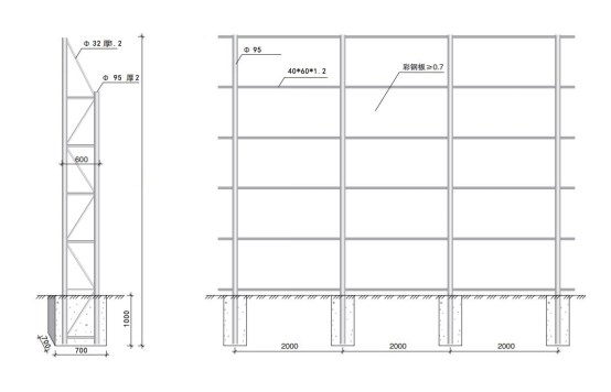 3、技術(shù)要求:圍擋高度5米,臨道路側(cè)鐵皮為綠色彩鋼瓦(約500米)、其余為藍(lán)色彩鋼瓦(約500米),彩鋼瓦厚度均為0.7mm;立柱總長度6米,其中地表以上5米,深入基礎(chǔ)1米,基礎(chǔ)寬度0.7米、長度0.7米,C25混凝土澆筑,立柱材質(zhì)為φ95毫米鍍鋅鋼管,間距4米;橫撐為φ32毫米鍍鋅鋼管;固定用方管尺寸為60毫米X40毫米厚鍍鋅方管,間隔1米;斜撐為60毫米X40毫米厚鍍鋅方管,間隔20米;