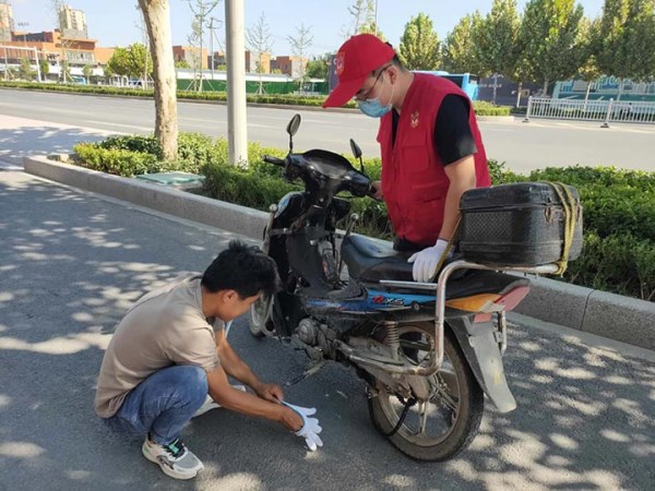 ![]() 菏建國(guó)投志愿者幫助市民修理摩托車 |