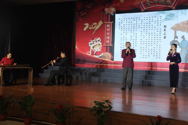 ![]() 菏建國(guó)投黨委副書(shū)記任永信(右二)帶來(lái)琴簫詠唱《陽(yáng)關(guān)三疊》 |
