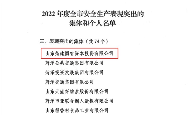 近日,菏澤市委市政府發(fā)布《關(guān)于表揚(yáng)2022年度全市安全生產(chǎn)表現(xiàn)突出的集體和個(gè)人的通報(bào)》,山東菏建國(guó)投榮獲菏澤市2022年度安全生產(chǎn)工作“表現(xiàn)突出集體”稱號(hào)。