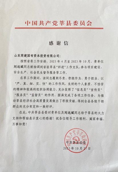 中共莘縣縣委向菏建國投發(fā)來感謝信