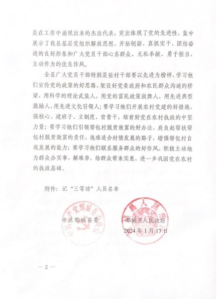 近日,中共鄄城縣委、鄄城縣人民政府發(fā)布關(guān)于獎(jiǎng)勵(lì)省、市派第一書記和工作隊(duì)員的決定,菏建國(guó)投選派第一書記油愿誠(chéng)、朱繼剛、李文生等三名同志榮獲個(gè)人“三等功”。