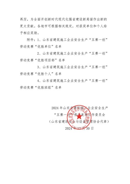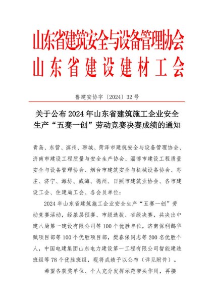 菏建集團榮獲2024年度山東省建筑施工企業(yè)安全生產“五賽一創(chuàng)”勞動競賽優(yōu)勝單位、優(yōu)勝班組、優(yōu)勝個人