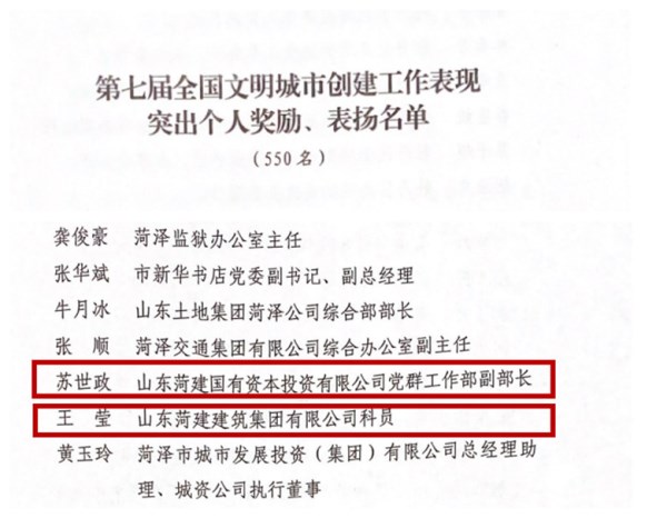 10月13日,菏澤市精神文明建設工作會議召開,對全國文明城市創(chuàng)建過程中涌現(xiàn)的先進集體與個人進行集中表彰。菏建國投公司憑借扎實有力的創(chuàng)城舉措與顯著成效,獲評“第七屆全國文明城市創(chuàng)建工作表現(xiàn)突出集體”;菏建國投職工蘇世政、菏建集團職工王瑩因在創(chuàng)城一線的積極作為與無私奉獻,榮獲“第七屆全國文明城市創(chuàng)建工作表現(xiàn)突出個人”稱號。