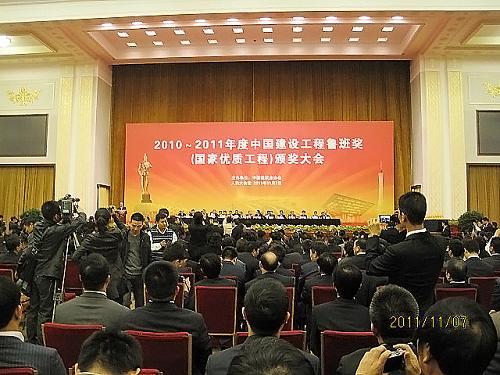11月7日,莊嚴(yán)的北京人民大會(huì)堂里,承載著建設(shè)者光榮與夢(mèng)想的200尊魯班金像熠熠生輝,2010~2011年度中國(guó)建設(shè)工程魯班獎(jiǎng)(國(guó)家優(yōu)質(zhì)工程)頒獎(jiǎng)大會(huì)在這里隆重舉行。住房和城鄉(xiāng)建設(shè)部副部長(zhǎng)郭允沖,北京市副市長(zhǎng)陳剛,中國(guó)建筑金屬結(jié)構(gòu)協(xié)會(huì)會(huì)長(zhǎng)姚兵,中國(guó)建筑業(yè)協(xié)會(huì)特邀顧問張百發(fā),住房和城鄉(xiāng)建設(shè)部有關(guān)司局、有關(guān)部門負(fù)責(zé)人以及各行業(yè)協(xié)會(huì)和有關(guān)部門代表共1200余人參加會(huì)議。市城鄉(xiāng)建設(shè)局局長(zhǎng)王乃光、市建管處副處長(zhǎng)孔繁東和集團(tuán)董事長(zhǎng)兼總經(jīng)理李信強(qiáng)、總工程師邵九憲、項(xiàng)目經(jīng)理南孟強(qiáng)參加大會(huì)并領(lǐng)獎(jiǎng)。