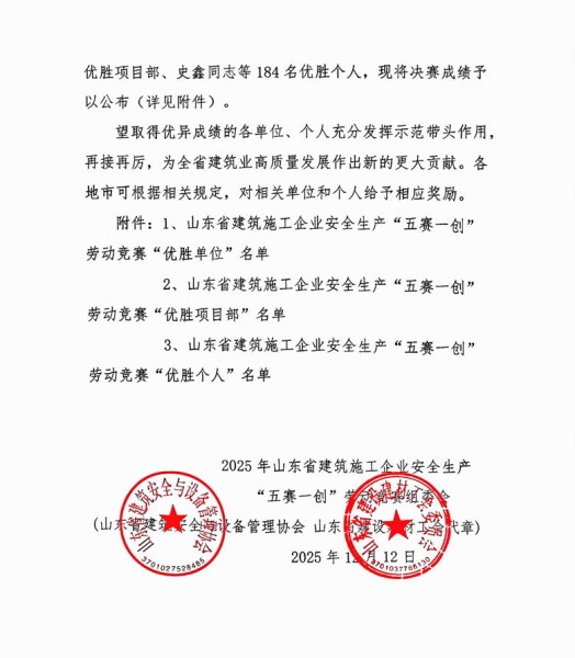 12月,山東省建筑安全與設(shè)備管理協(xié)會(huì)、山東省建設(shè)建材工會(huì)聯(lián)合發(fā)布《關(guān)于公布2025年山東省建筑施工企業(yè)安全生產(chǎn)“五賽一創(chuàng)”勞動(dòng)競(jìng)賽決賽成績(jī)的通知》,東方樾府A區(qū)二標(biāo)段項(xiàng)目憑借扎實(shí)的安全管理基礎(chǔ)和卓越的競(jìng)賽表現(xiàn),榮獲“優(yōu)勝項(xiàng)目部”稱號(hào)。