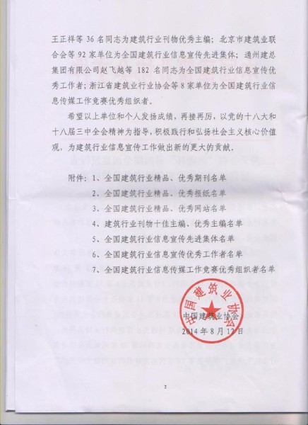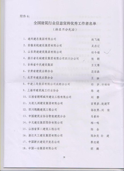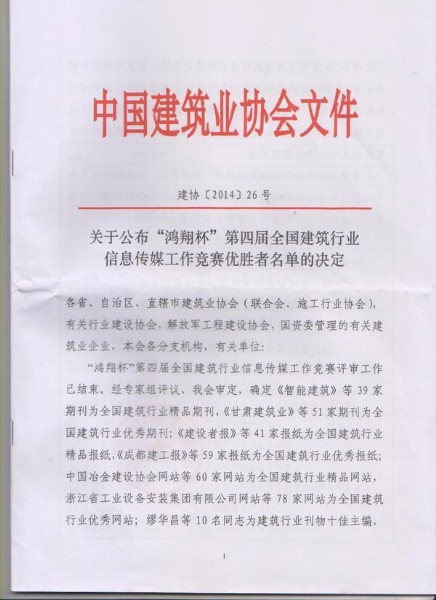 8月12日,在中國建筑業(yè)協(xié)會(huì)下發(fā)的建協(xié)[2014]26號(hào)《關(guān)于公布“鴻翔杯”第四屆全國建筑行業(yè)信息傳媒工作競賽優(yōu)勝者名單的決定》文件中, 按照參評(píng)要求,優(yōu)中選優(yōu)、實(shí)事求是推薦,經(jīng)中國建筑業(yè)協(xié)會(huì)組織專家評(píng)審、審核確定, 集團(tuán)公司被評(píng)為“全國建筑行業(yè)信息宣傳先進(jìn)集體”,《菏建集團(tuán)報(bào)》被評(píng)為“全國建筑行業(yè)精品報(bào)紙”,集團(tuán)網(wǎng)站被評(píng)為“全國建筑行業(yè)優(yōu)秀網(wǎng)站”,杜令瑞同志被評(píng)為“全國建筑行業(yè)信息宣傳優(yōu)秀工作者”。這是菏建集團(tuán)報(bào)紙和網(wǎng)站首次榮獲全國最高獎(jiǎng)項(xiàng),同時(shí)也填補(bǔ)了全市建筑行業(yè)信息傳媒工作中的一項(xiàng)空白。