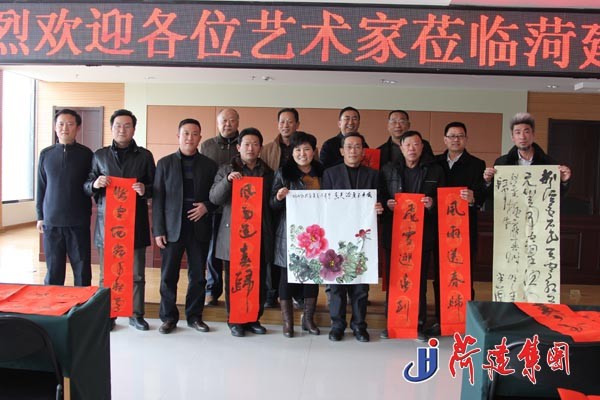 在集團二樓會議室活動現(xiàn)場,書畫家們現(xiàn)場潑墨揮毫,吟詩作畫,氣氛熱烈,贏得了參觀人員的陣陣贊嘆聲。藝術家們現(xiàn)場創(chuàng)作的一幅幅春聯(lián)、書畫作品,生活氣息濃郁,創(chuàng)作手法新穎,表現(xiàn)視角獨特,展示著中國書畫藝術的深厚底蘊,既有積極向上的思想內(nèi)涵,又有較強的藝術感染力和較高的欣賞價值,極大開闊了職工的視野,受到廣大職工的熱烈歡迎。上午,書畫大家們共創(chuàng)作了作品50余幅,全部現(xiàn)場贈送給菏建集團。